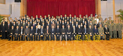 ■中共中央政治局常委、全國人大常委會委員長吳邦國在中聯辦與中央駐港機構負責人和駐港中資機構代表合影。 新華社