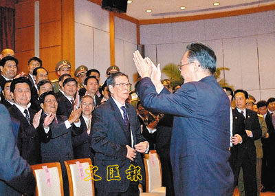 ■吳邦國發表講話,會場氣氛親切熱烈。 中新社