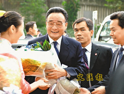 ■吳邦國抵達中聯辦後,工作人員送上鮮花熱烈歡迎。 中新社