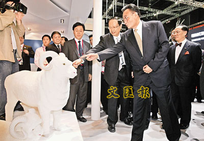 ■吳邦國親手撫摸中國移動的高科技「白羊」。 美聯社