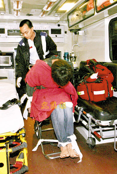 ■企跳男子被五花大綁送院。