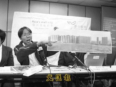 ■譚凱邦手持海岸照片,指出濱海新樓有7成半是「屏風樓」,影響全港約150萬人。本報記者黃慧珊 攝