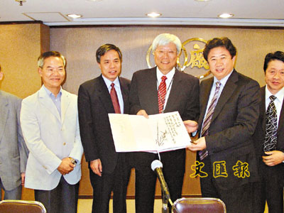 ■廠商會會長洪克協(左三)與副會長羅富昌(左一)接受全國政協委員、中央民族大學東方文化藝術研究所所長王林旭(右一)送贈畫冊。