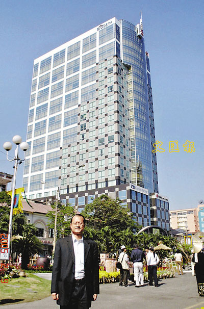 ■新華集團總裁蔡冠深在位於越南胡志明市的新華廣場前留影。