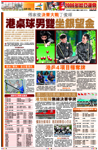 【本報訊】(記者 郭思華)經過前天由16強至4強的「馬拉松式」賽事,首次拍檔就參與亞運英式桌球雙打賽的香港組合傅家俊和陳偉麒,成功打進昨晚深夜舉行的決賽。這對「神奇組合」在決賽面對的是中國的「神童組合」丁俊暉與田鵬飛,到底勝利之神會站在「神奇小子」的一方,還是「中國神童」那一方?