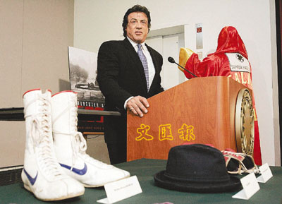 目前史泰龍積極替翻身之作《洛奇6》進行宣傳,其中一項工作便是把他「進軍」國家歷史博物館。前天龍哥出席華盛頓一個記者會,為的是將象徵「美國夢」的電影角色洛奇變成歷史一部份,他捐出數件道具如招牌黑色帽子、拳套、短褲、拳擊專用鞋以及那件寫上肉食公司贊助名字的長袍,一來可讓洛奇名垂千古,二來又能為電影造勢,一石二鳥確是高招。 ■文:藝能小子/圖:路透社