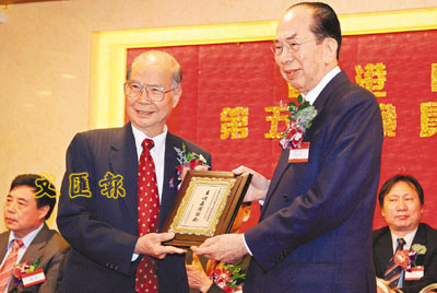 ■中山古鎮鎮同鄉會理事長區汝強(左)贈送紀念品予李東海。 本報記者曾慶威 攝