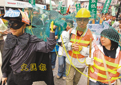 有民間團體昨日遊行,反對本港大財團借「大市場、小政府」來牟取暴利。示威人士要求政府放棄「大市場、小政府」這個教條,並制訂全面、有利社會各階段發展的政策,及盡快訂立最低工資。本報記者潘政祁 攝