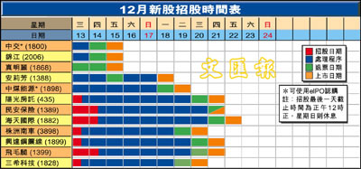 新股潮即將完場,大部分股民均選擇金融保險股—民安作最後衝刺。10間證券商共借出134億元孖展,超額101倍。若按此超額倍數,民安已能啟動回撥機制,將公開發售比例由10%提升至50%。新鴻基、凱基、光大、時富及京華山一已提前截止民安的孖展認購。與民安同日招股的飛毛腿及海天借出孖展分別32及74億元,超額亦達60倍及49倍。即將掛牌的真明麗宣布,公開招股部分超額48倍,並以上限6.9元定價。啟動回撥機制後,公開部分比例由10%提升至30%。市傳其暗盤價為8.2元,較招股價高出約19%。公開招股部分獲超額410倍的錦江,市傳其暗盤價達3.2元,較招股價高出近5成,中交暗盤價料見8.75元,較招股價上限高出九成,3股將於本周五同日掛牌。