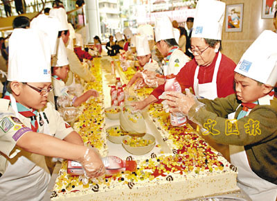 世紀香港酒店為慶祝15周年,製作全港最長的生日蛋糕與市民分享,並嘗試打破香港紀錄。昨日,酒店邀請70名獨居老人及英華小學的幼童軍聯同酒店員工,齊心合力以鮮果、朱古力、花生等粉飾蛋糕表面,蛋糕以兩個巨型數字「1」及「5」組合而成,總重量達600磅,150呎長,可供2,000人享用。切餅儀式後,酒店員工隨即分餅給市民及鄰近的店舖員工品嚐,現場出現長長的人龍排隊取餅。 本報記者李志樑 攝