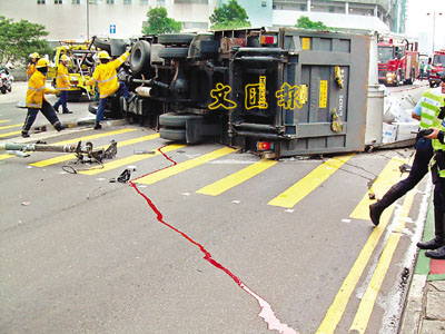 【本報訊】屯門青山公路昨午發生恐怖奪命車禍,一輛運載成人尿片的密斗貨車,疑高速轉彎失控打橫滑行,撞毀兩支交通燈柱後翻側,司機及跟車工人當場被困,其中司機爆頭噴血,腦漿濺出,鮮血如泉湧,流至車外30米遠,送院不治。據悉,身亡司機是一位疼愛女兒的好父親,寧願自己的人壽保險斷保,也要堅持為女兒的讀書保險供款,他如今不幸逝世,令妻子及剛上幼稚園的女兒頓失依靠。