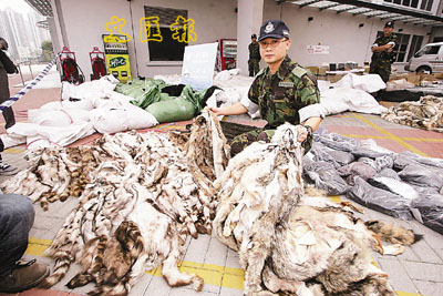 【本報訊】水警前晚在西貢塔門海面破獲歷來最大宗走私皮草案,案中兩艘越境「中飛」在西貢海面,將價值逾2,500萬元的名貴皮草及電器走私返內地時,與水警發生追逐,水警快艇採「死胡同」戰術,追逼得兩艘中飛剷上西貢黃石碼頭附近的土瓜坪岸邊擱淺,5名男子棄船上岸逃去,水警通宵搜捕無發現,昨將所有走私物品(包括70袋價值2,300萬元名貴貂皮與狐皮)轉交海關跟進,是次為水警一個月內檢獲的第二批走私皮草。