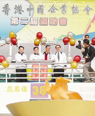 ■北京奧組委執行副主席劉敬民(右一)、中聯辦副主任鄭坤生(左二)及大會籌委會主席秦曉(左三)、顧問張學武主持開幕亮燈儀式。