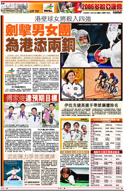 民政事務局局長何志平亦代表香港市民祝賀香港劍擊隊在多哈亞運會男女子團體項目取得銅牌,並鼓勵香港代表隊在亞運餘下比賽項目中繼續為港爭光。另外黃金寶與張敬煒在昨日的男子單車場地記分賽中無驚無險闖入決賽,將於今日爭取獎牌。