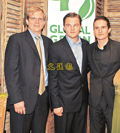 ■里安納度狄卡比奧(中)與奧蘭度布林(右),一起出席全球綠化運動的義賣。 美聯社