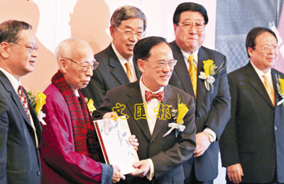 ■饒教授親自送上紀念品,答謝曾蔭權及各嘉賓對其作品展覽的支持。本報記者曾慶威 攝