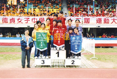 ■德貞女子中學運動會,四乘一百米接力賽冠、亞、季軍健兒大合照。