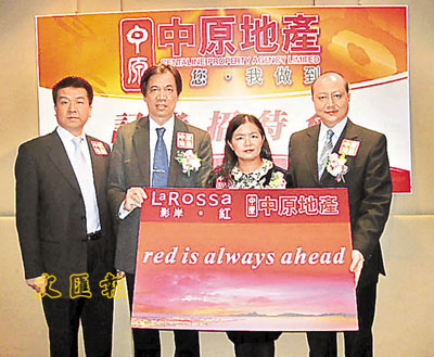 ■香港興業市務經理林紅(右二)於記者會上以red is always ahead向中原地產營業董事周永輝(右一)作出鼓勵。