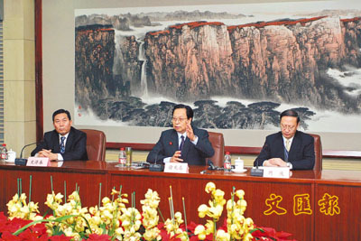 ■左起:河南省副省長史濟春、河南省委書記徐光春、香港新聞聯副主席周慶。
