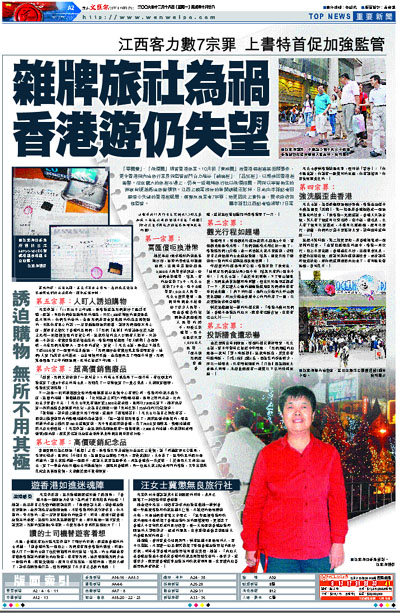 「零團費」、「低價團」禍害香港旅業。10月初「青海團」被香港導遊遺棄街頭事件,更令香港與內地旅行業界與監管部門合力催谷「誠信遊」、「品質遊」,以期挽回香港遊聲譽。但在龐大的旅遊市場上,仍有一些雜牌旅行社以低價接團,再與以宰客為生的商家軟硬兼施迫旅客購物。江西上饒電視台的新聞編輯汪彩萍,日前向本報記者回顧傷心失望的香港遊經歷,痛數無良業者7宗罪;她更因此上書特首,要求政府加強監管。