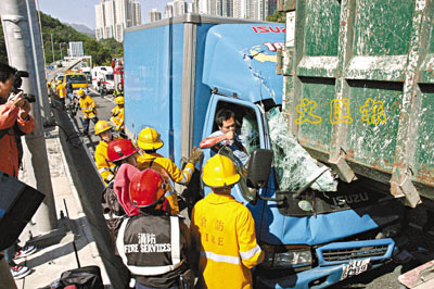 ■運冰車落斜失控,狂撼貨車尾部後車頭嚴重損毀,司機及跟車被困,消防員正設法拯救。