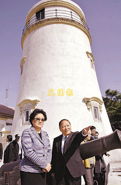 ■劉延東(左)在白志健陪同下參觀了澳門著名景點東望洋燈塔。