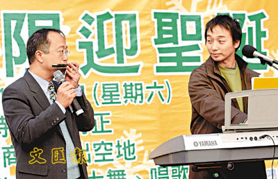 ■陳鑑林於聖誕活動中與兒子(右)合唱,並表演口琴。本報記者李志樑 攝