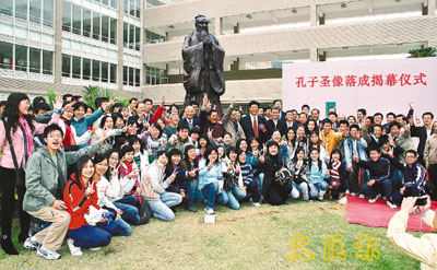 作為中國最著名的師範高校,北師大珠海分校校慶的重頭戲之一是孔子銅像落成揭幕。上周六上午,在北師大教育學院門前,高度接近五米的孔子全身銅像第一次展現在師生面前。作為捐贈人的湯恩佳表示,北師大的前身京師大學堂與香港孔教學院有不少淵源。他說,孔子是中華民族的精神導師,要將民族精神納入國民教育,就應先將孔子儒家思想納入到公民教育之中。