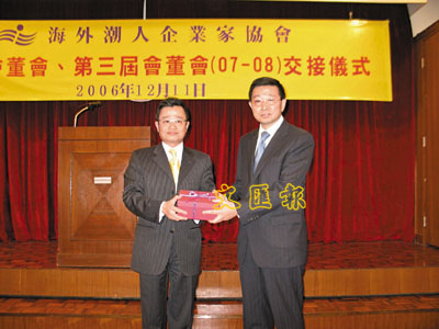 ■方平主席(右)從劉坤銘手中接過該會印信。本報記者潘曉平 攝