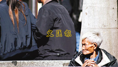■一位老乞丐在路邊休息。本報記者鄭海龍 攝