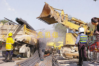 結果在消防員指揮下,林有喜駕駛推土機先後推開泥頭車及載鋼筋貨車,令有關人員可以加快清理現場,否則路面需要封閉更久。