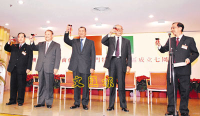 ■(左起)澳門中華總商會理事長許世元、澳門中聯辦主任白志健、行政長官何厚鏵、外交部駐澳特派員萬永祥、澳門中華總商會副理事長馬有禮出席澳門中華總商會慶祝澳門回歸七周年酒會。 本報澳門傳真