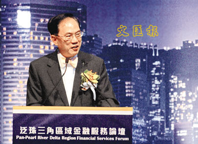 ■曾蔭權曾在不少場合,提及要配合內地,發展本港金融業務。圖為他在「泛珠金融服務論壇」開幕式上發表演說。 資料圖片