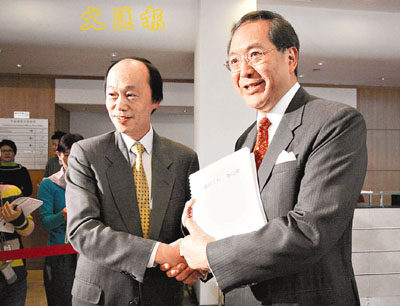 ■高彥鳴(左)向李國章提交教師工作報告,並提出多項建議。 本報記者潘政祁 攝