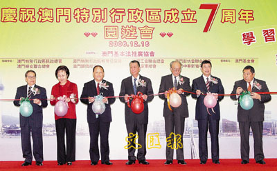 ■行政長官何厚鏵(中)等為慶祝澳門特區成立七周年園遊會剪綵