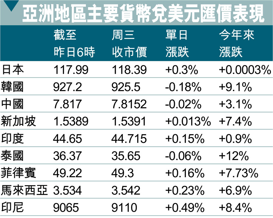 亞洲地區主要貨幣兌美元匯價表現