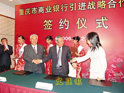 香港大新集團昨日宣布以6.94億元(人民幣,下同)獲得重慶市商業銀行17%股權,成為首家進入重慶銀行業的戰略投資者,也成為重慶商銀第二大股東。而美國凱雷投資則獲得重慶商銀7.99%股權。這次,重慶商銀是以約10.1億元出售5億股給該兩家外資機構,合共佔其24.99%股權。大新主席王守業表示,未來將會派3人進入董事局。而昨日在重慶的簽約儀式上,重慶市委常委、常務副市長黃奇帆透露,重慶商銀擬於明年赴港上市。