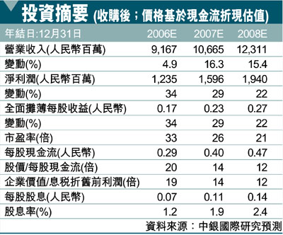 在收購廣坪線後,我們認為廣深鐵路(0525)的整體發展將開始提速。預計06年至08年廣深鐵路收入的年均複合增長率將達到15.9%,每股收益年均複合增長率實現25%。由於A股市場走強且廣深鐵路與同業相比增長勢頭最為強勁,我們將A股合理價格區間定為22-25倍的07年預期每股收益0.23元人民幣。根據較為保守的現金流折現法,我們認為廣深鐵路A股的目標價格為5.78元人民幣。