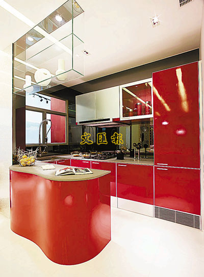 開放式廚房亦以紅色作主調,與客飯廳色調形成強烈對比。波浪型設計的備餐桌,與飯廳餐桌的線條配合完美。