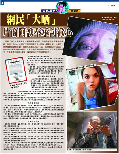 美國《時代》新聞周刊以電腦屏幕為封面,如鏡子般反映出讀者的樣貌,宣佈「你」(You)是2006年度風雲人物,即指全球數以億計的網民,他們自創的網絡日誌、視頻共享網站YouTube、社交網站MySpace、Wikipedia維基百科全書等,改變了傳統資訊發放的方式。在現今資訊年代,互聯網使用者自己當家,操控資訊的內容和發放途徑。
