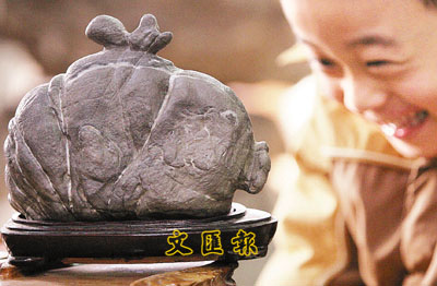 在南京清涼門大街河西花卉市場的湯達生活藝術工作室裡,一塊為水沖石的「發財豬」背上的一隻松鼠更給這頭「小豬」增添了情趣,寓意新年「輕鬆發財」。中通社