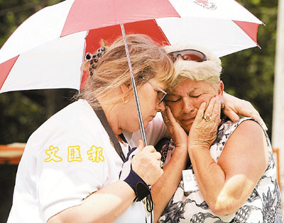 ■兩位德國女遊客參觀泰國攀牙的海嘯死難者墓地時,忍不住痛哭。 路透社