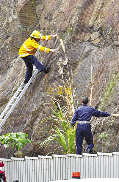 【本報訊】維修山坡的鐵絲網成受保護麻鷹陷阱。一頭成年麻鷹,昨午疑四出覓食期間,跌落牛頭角一幅山坡與鐵絲網之間,並滑入10米山坡下石隙被困,頓時「插翼難飛」;消防員奉召到場,欲剪開鐵絲網救鷹時,卻因牠不斷掙扎未能成功,最後需拉起鐵絲網,讓麻鷹再滑落20米至地面始將牠救起,右翼擦傷,後送往接受獸醫治療,再交由嘉道理農場專家處理。