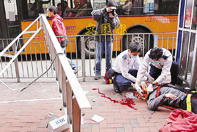 ■換燈泡管理員自簷篷墮地,壓塌鋁梯頭部重創鮮血直冒,救護員在場為他包紮。