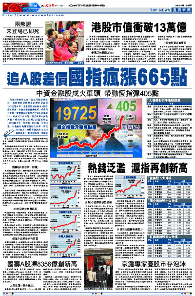 內地A股連升三日,加上外圍全線造好,刺激港股於假期後創歷史新高至19,700點水平;受惠於稅制改革及H股回歸等消息,中資金融股繼續瘋漲,成升市火車頭,帶動國企指數昨大升665.24點近7%,收報10258.31點,首次突破一萬點大關。恆指昨裂口高開300點彈升上19600點水平,收市報19725點,升405點,以點數計為歷來第四大升幅,成交484億元,港股市值創出13.234萬億新高。