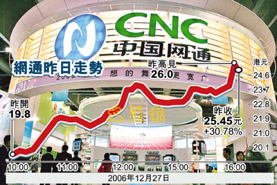 聖誕假後,國企指數升破一萬點,港股再發威。藍籌股中,以中國網通(0906)表現最一鳴驚人,股價狂升近6元,由上周五收市的19.46元急升31%,昨日收報25.45元,創上市新高,升幅是藍籌中最勁;主要受該集團擬購聯通(0762)資產以獲3G牌傳聞刺激。雖然網通發言人王霞在收市後否認有關消息,並強調集團現時無意在內地A股上市,但該傳聞亦令聯通大升8%,收報11.4元。