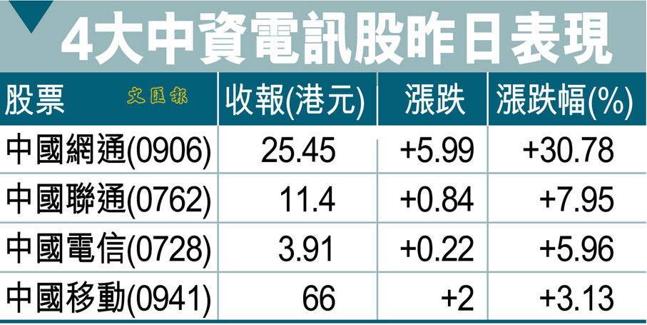 4大中資電訊股昨日表現
