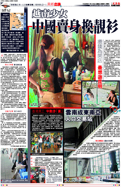 「販賣活動多以中國雲南為通道、泰國為中轉,最終使『貨品』流向香港、台灣以及馬來西亞、新加坡、日本等地的色情行業。」聯合國機構間湄公河次區域反拐項目辦公室(以下簡稱UNIAP)顧問、研究員蔣烽接受本報記者獨家採訪時表示,香港業已成為「貨品」輸入量較大的地區。