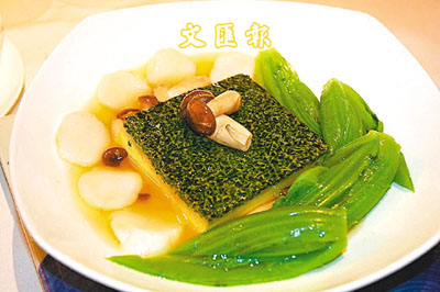 「養生豆腐」,豆腐加上雞蛋成黃金狀的賣相,豆腐表面以菠菜覆蓋,口感獨特,每啖均有豐富的香豆味,清淡而不油膩,配搭鮮帶子、銀菇,實為一客養生美點。