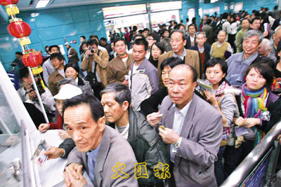 住在番禺的張先生一家,本來是想帶著一對雙胞胎女兒來坐車玩的,結果人越擠越多,只好遺憾地下車了。列車14時10分從番禺出發,到了第二站市橋,車內車外的人都不約而同一聲「哇,好多人。」但為了搭乘到第一班車,站台上的乘客還是拚命的往裡面擠。一直到第5班車,趟趟列車都擠得沒有空隙,乘客既難下又難上。